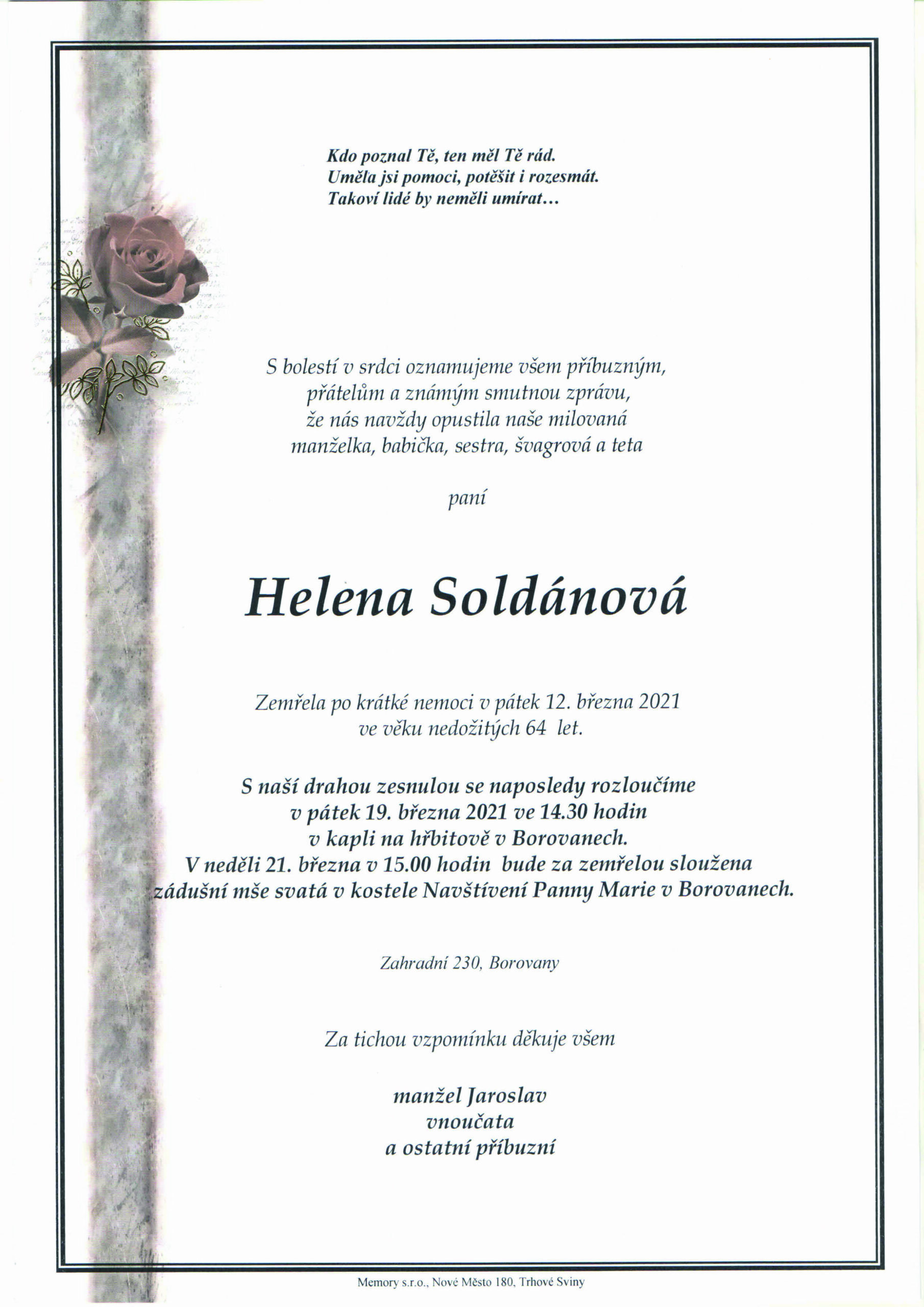 Smuteční oznámení Publikováno 14. 3. 2021Aktualizováno 12. 4. 2021Od sdhborovany1Kategorie:Nezařazené S velkou lítostí oznamujeme, že naše řady opustila Helena Soldánová. Mnohaletá činovnice sboru a současná režisérka loutkářského souboru Jiskra. sdhborovany1 www.sdhborovany.cz