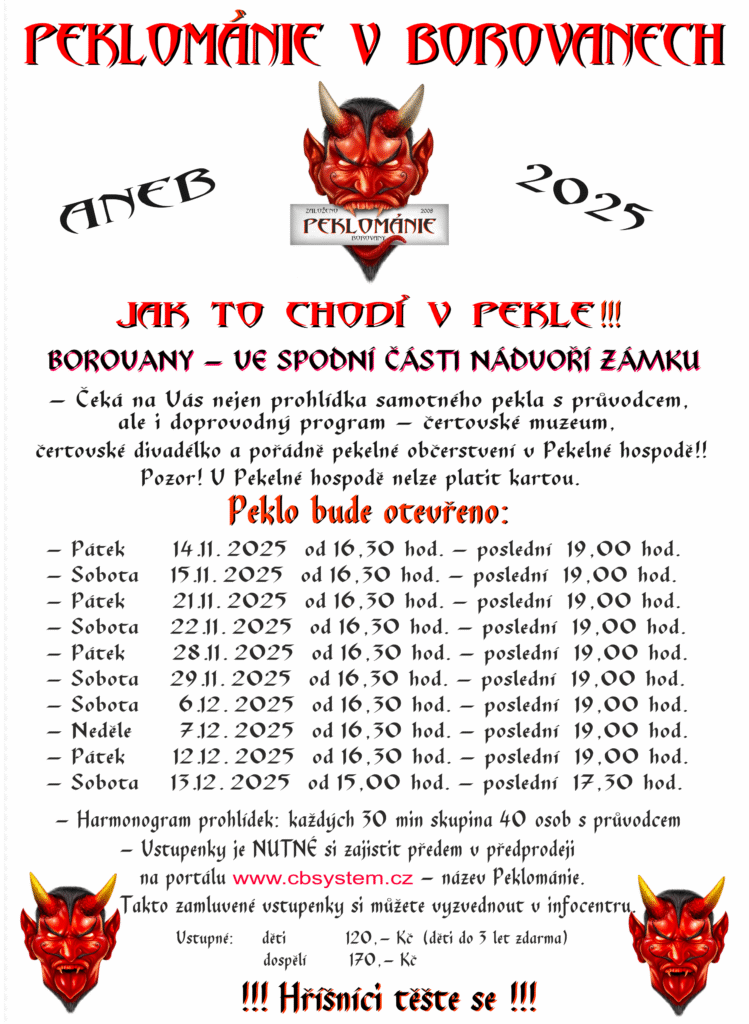 Čeká na vás nejen prohlídka samotného pekla s průvodcem, ale i doprovodný program – čertovské muzeum, čertovské divadélko a pořádně pekelné občerstvení v Pekelné hospodě!!
